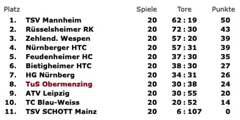ATV Leipzig kam bei den Wespen nicht über ein 1:1 hinaus und konnte mit 4 Punkten Rückstand auf TuS am letzten Spieltag nicht mehr an TuS vorbeiziehen. Somit standen mit ATV Leipzig, Blau-Weiss Berlin und TSV Schott Mainz eigentlich die 3 Absteiger fest. Am Sonntag wurde über die Hockey-Medien jedoch folgende Mitteilung publik: