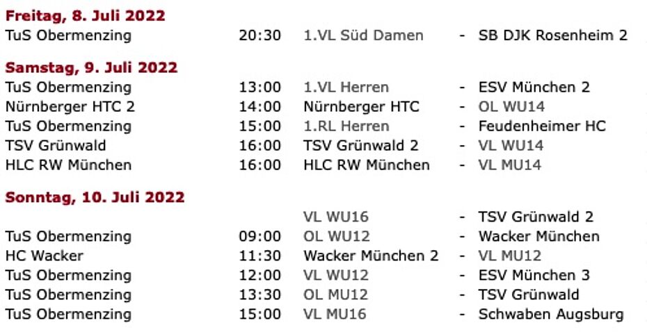Waren letztes Wochenende die Plätze für die Kleinfeld- und Mini-Mannschaften reserviert, sind morgen bzw. übermorgen neben den Ersten Herren, Zweiten Herren und Zweiten Damen die U 12- bis U-16-Teams aktiv. Hier der Spielplan im Einzelnen: