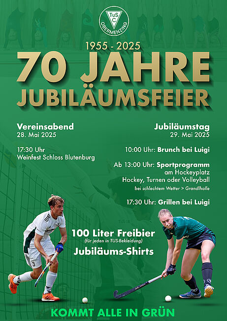 Siebzig Jahre TuS! Das muss gefeiert werden – und zwar mit euch! Wir laden herzlich ein zur großen Jubiläumsfeier am 29. Mai 2025. Schon am Vorabend, dem 28.05., stoßen wir auf dem Weinfest Schloss Blutenburg an. Damit wir besser planen können, bitten wir um eine kurze Anmeldung bis Morgen, den 16.05.2025 über dieses