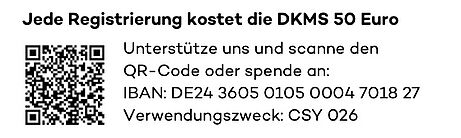 Ihr könnt die DKMS zusätzlich auch durch Geldspenden unterstützen, da jede Registrierung 50 EUR kostet.